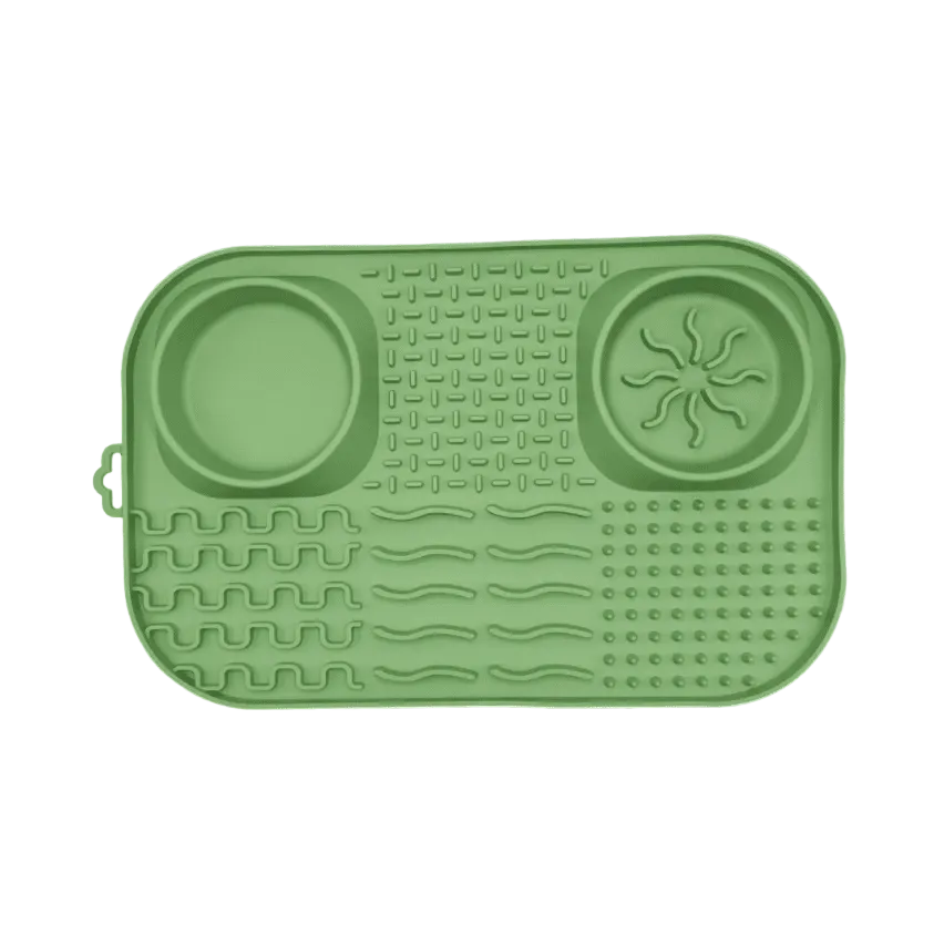 Fiboo’s roliga buffé-matta kommer med två skålar och fyra olika slickytor. Mattan har också olika texturer som uppmuntrar långsamt ätande och stimulerar hundar eller katter under måltiden. Perfekt för mindre hundraser och katter där den hjälper till att minska hetsätning samtidigt som det håller dem sysselsatta.